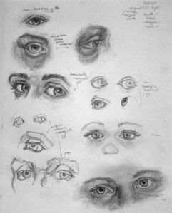In my figure drawing class, we’ve been focusing on close studies of individual features. I’ll be posting two pages each for eyes, noses, mouths & ears over the next few days. I drew most of these from references – both from drawing books & online resources (you may be able to make out my handwriting for the names of the authors) as well as from photos. I also used a mirror for a couple of the features – can you guess which?
