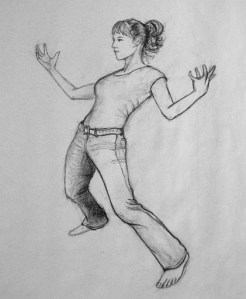 In my figure drawing class, we recently had an assignment requiring stretching & compression of form – ie bending of limbs, torso, etc so that you can see the compression on the bent side and the way the form stretches on the opposite side. Nick helped me take reference photos of myself so you may recognize the model :).