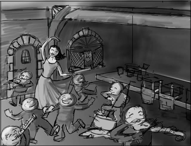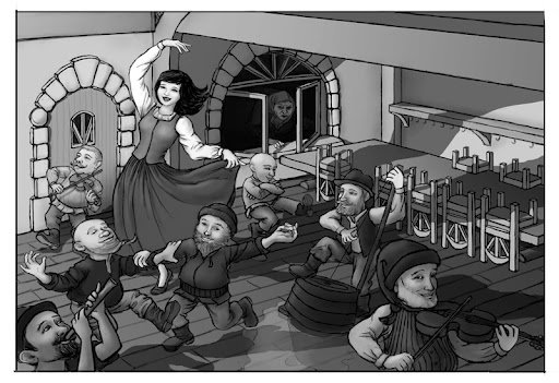 The assignment was to illustrate an excerpt of “Snow White” … of course, I forgot to save the text… but to paraphrase, Snow White & the dwarves (none of them higher than Snow’s waist) have just finished cleaning all day. After a good supper, they all celebrate with dancing and fiddle music. Nobody notices the evil old witch, staring in the window from outside.