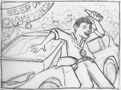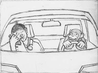 Our most recent assignment for storyboarding is to do a new take on the “trunk monkey” advertising campaign (here’s a link to the real commercials that aired around 2006). We had to create just 4 cleaned-up presentation boards to get our concept across – these are meant to be a summary of the concept for a pitch rather than move-by-move production boards. I went with designated-driver trunk monkey: