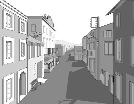 So this past week, the assignment was to add shadows. I am happy to say that I did not spend 20+ hours (probably closer to 10), but I’m pretty happy with the result. I was able to add in some window panes, some railings on those balconies, some plants, hills off in the background & electric poles/streetlights. Oh, and that little bench, which I retroactively realized was kind of masochistic for someone who had to add shadows. It all worked out though: