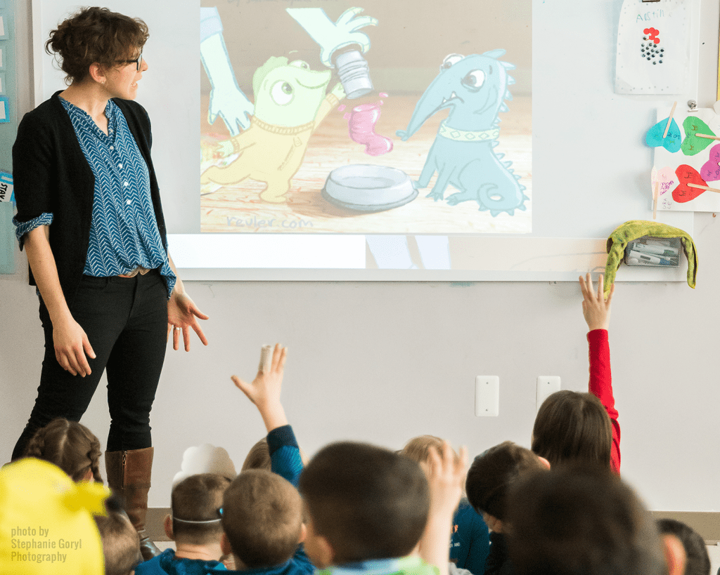 My visits are full of behind-the-scenes images, detailing my process of writing & illustration. I talk about my connections to animation and how I gather ideas, draft stories, sketch, revise, and create final art. With smaller groups (50 or less), we can play an interactive storytelling & drawing game, and larger groups often get a sneak peek into future projects. I currently offer two main presentations, both with built-in time for Q&A: